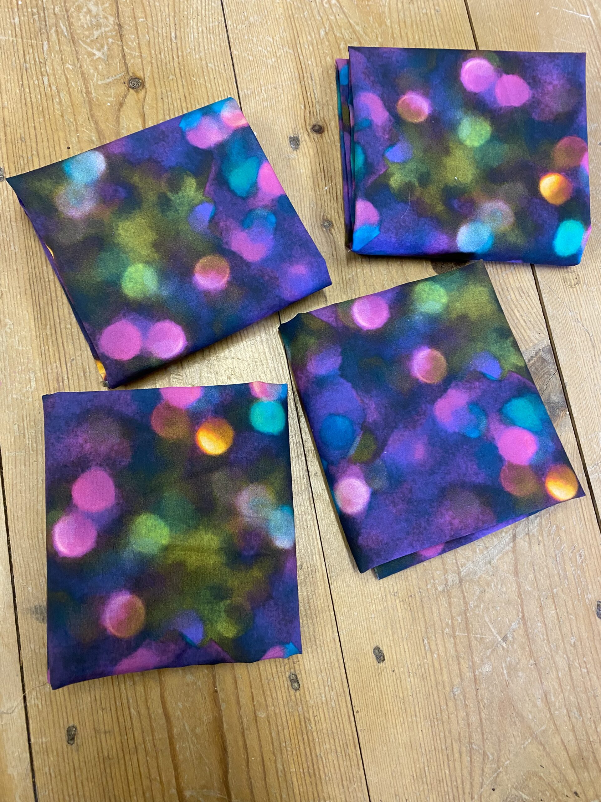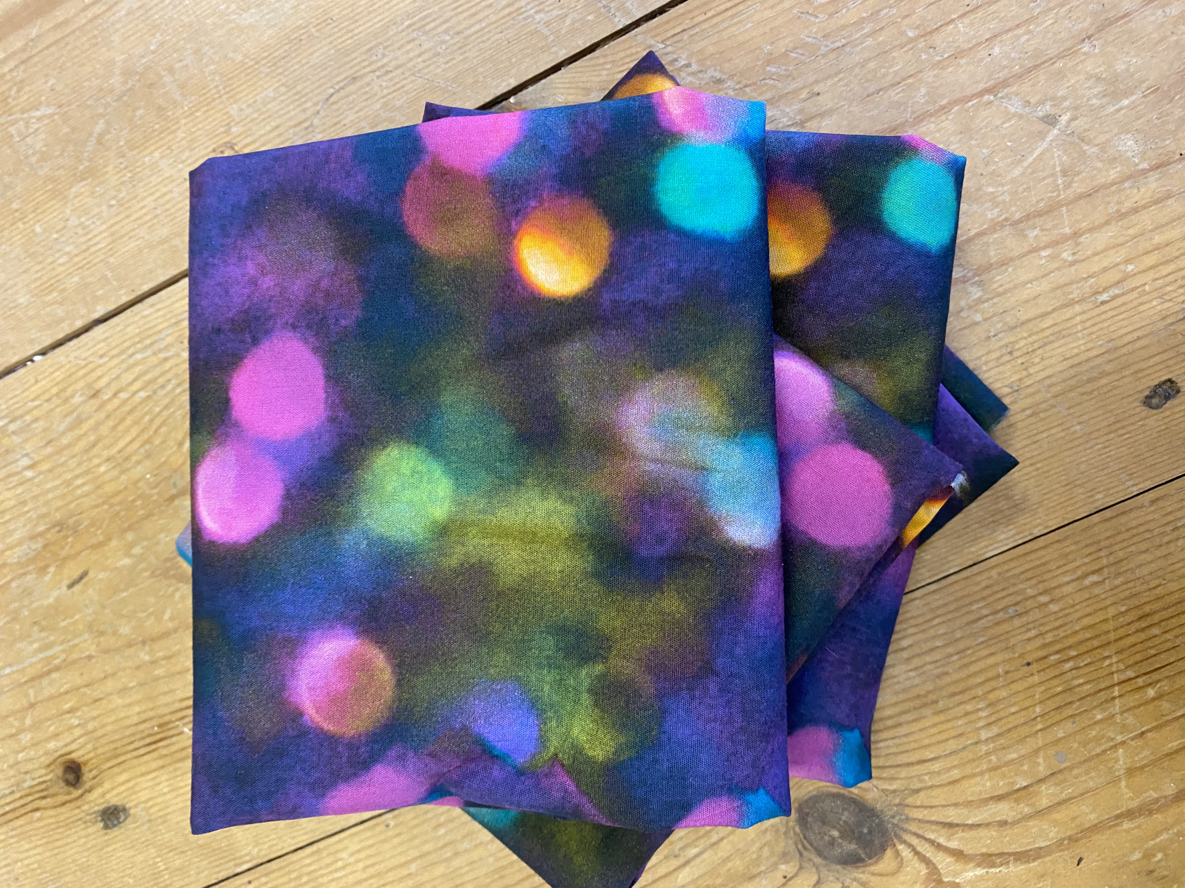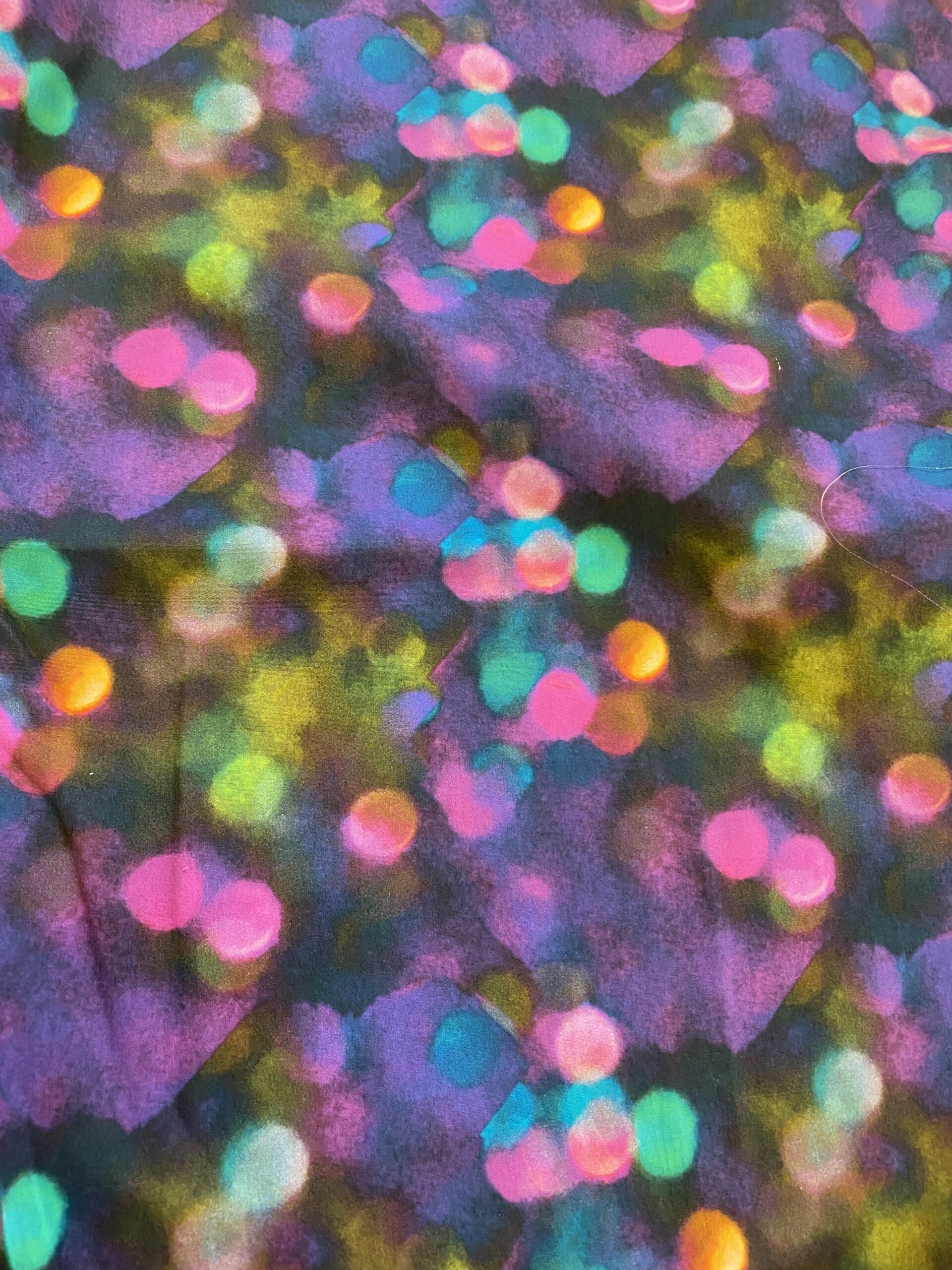 Lovely disco lights with purples pink and a hint of teal . Designed by Jo . In cotton poplin . Fabric measures 50cm x 55cm