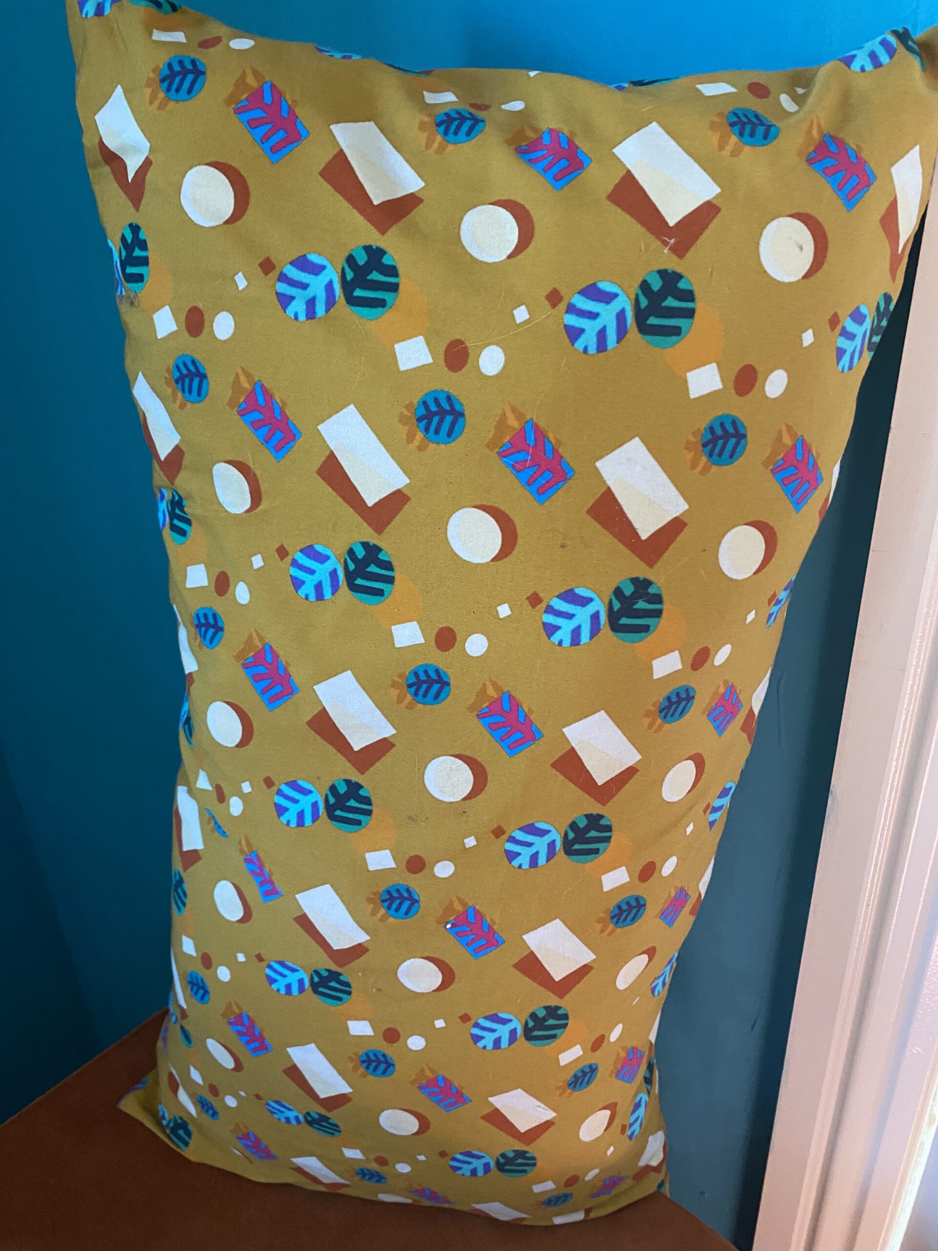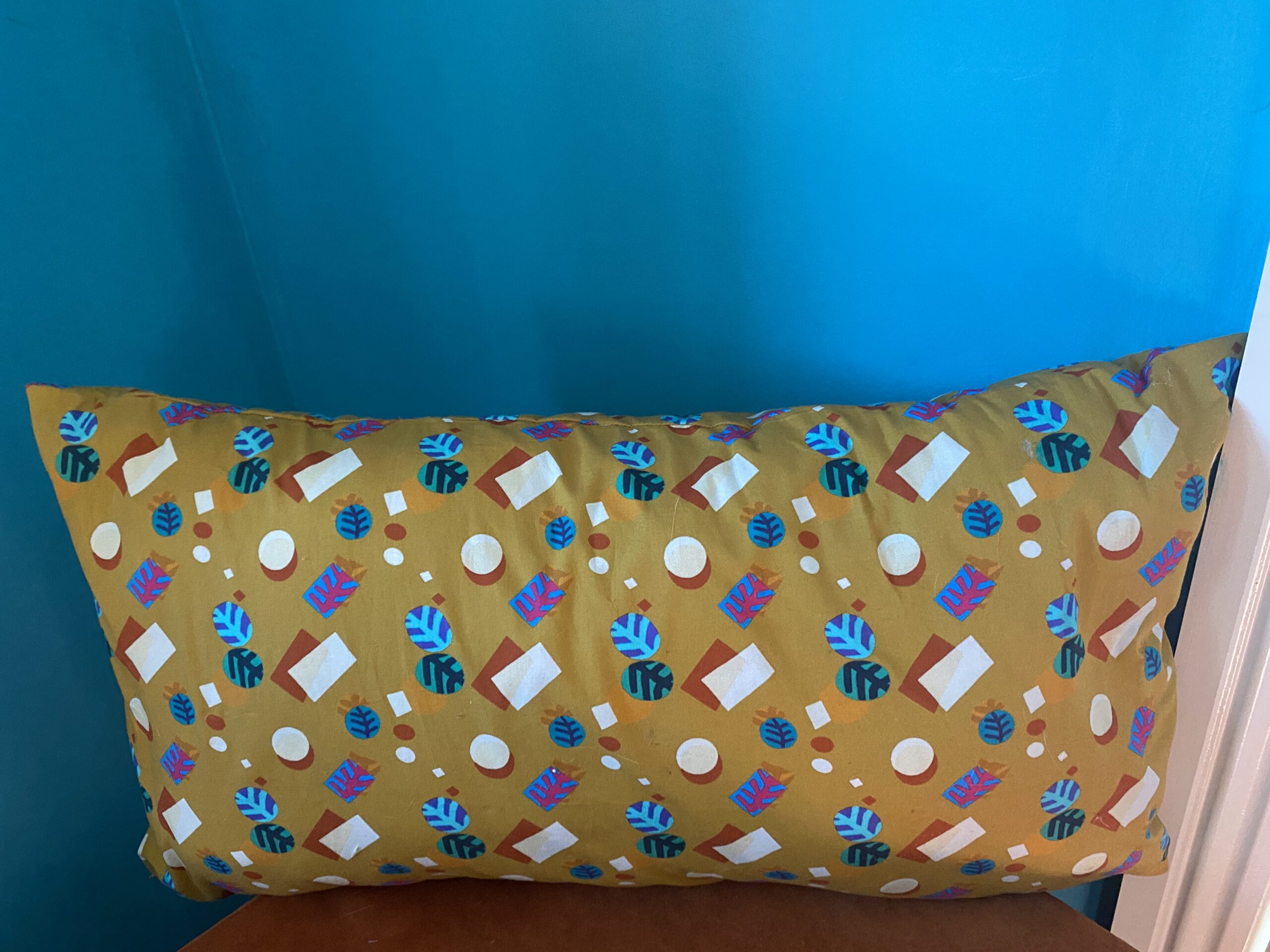 Mustard leaves and shapes fabric used to make this cushion . With polyester filling and envelope style cover .Measuring 34cm x 60cm a statement piece for any sofa !