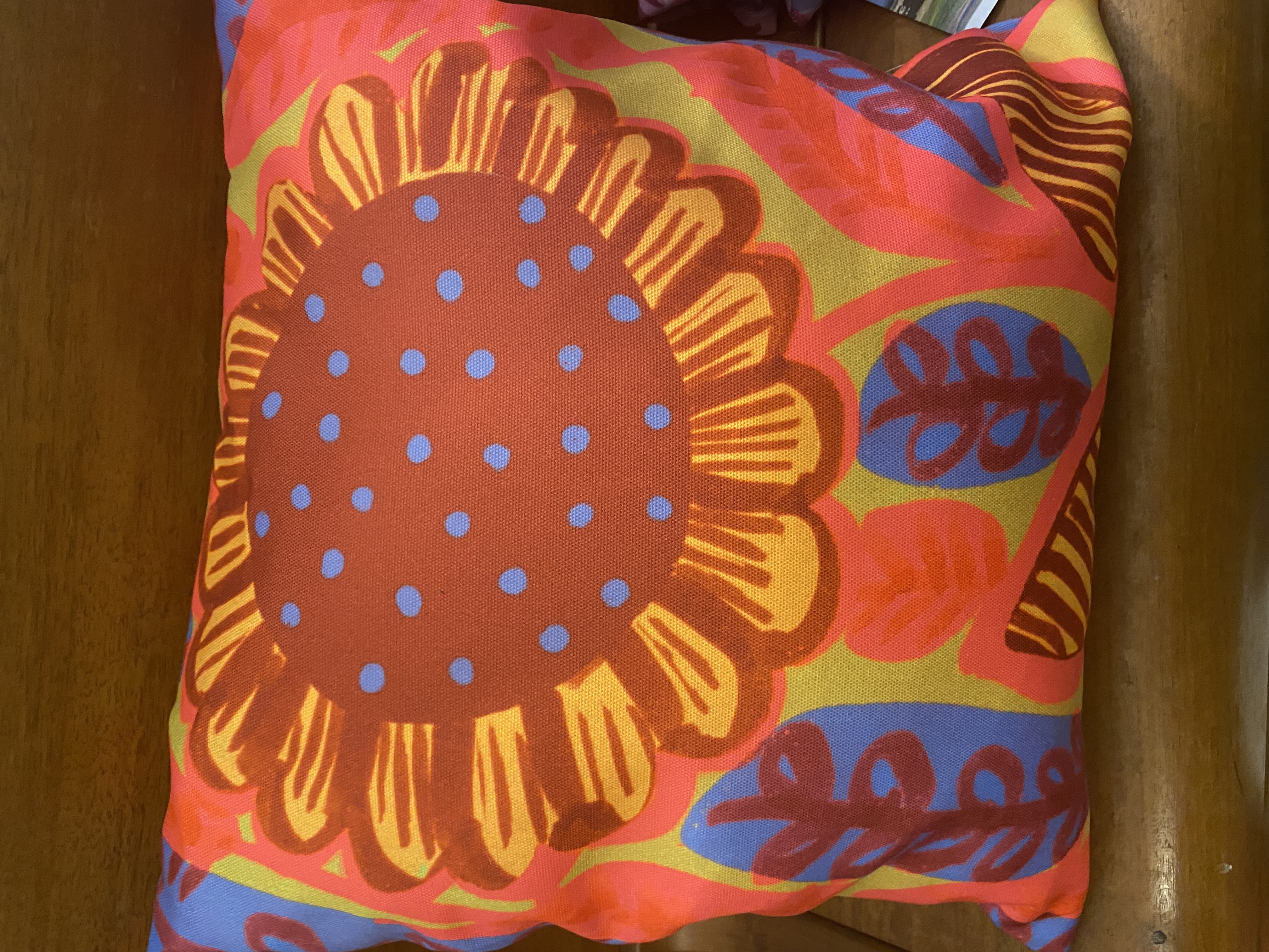 Vintage Brights Flower Cushion to bring some Zing !  The cushion is double sided print with zip closure . Made from polyester. Cushion measures 38cm x 38 cm and comes with cushion !